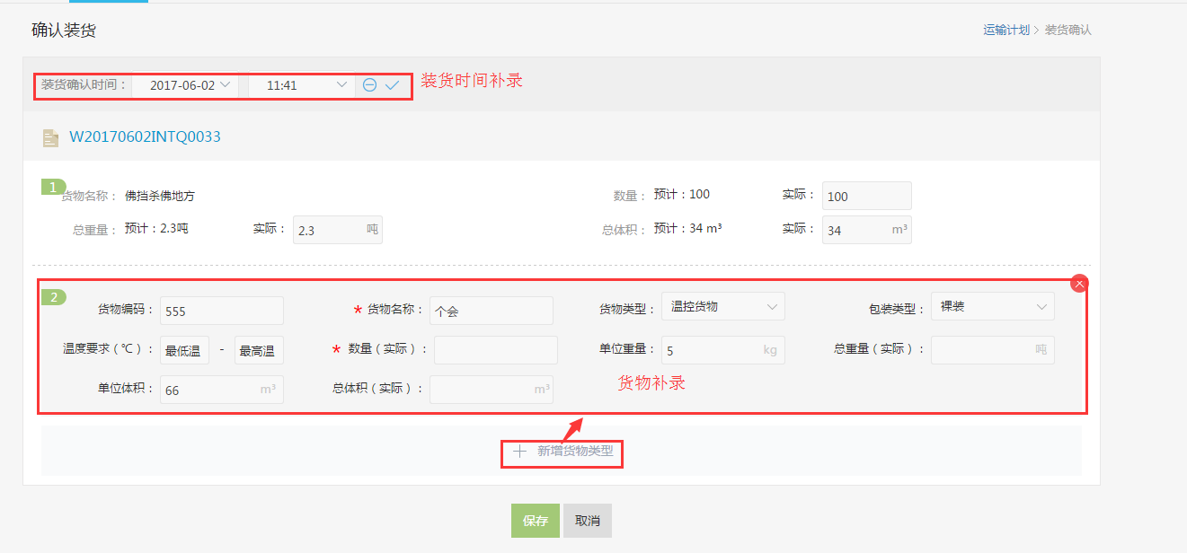 到达起点后,进行装货确认。装货确认时,可进行装货时间补录及货物补录。装货确认完成后,订单变为【待发车】,即该订单即将离开起点,如下图所示: