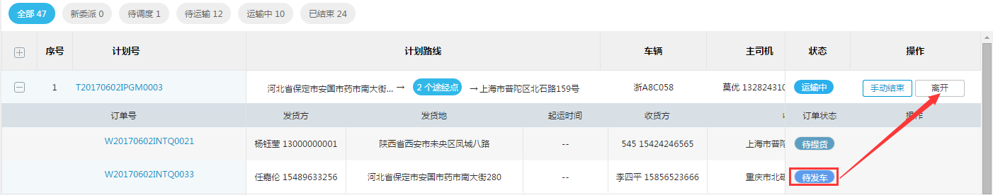 离开起点后,计划仍为【运输中】,订单为【待到达】,如下图所示: